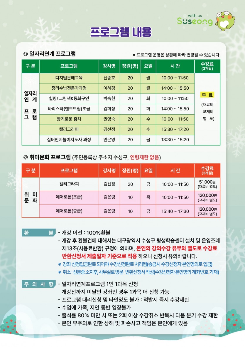 • 개강 후 환불건에 대해서는 대구광역시 수성구 평생학습센터 설치 및 운영 조례 제13조 (사용료 반환)