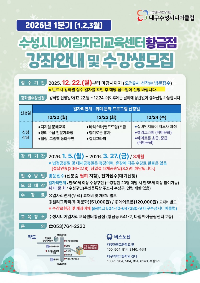 2026년 1분기 시니어일자리교육센터(황금점) 강좌안내 및 교육 수강생 모집